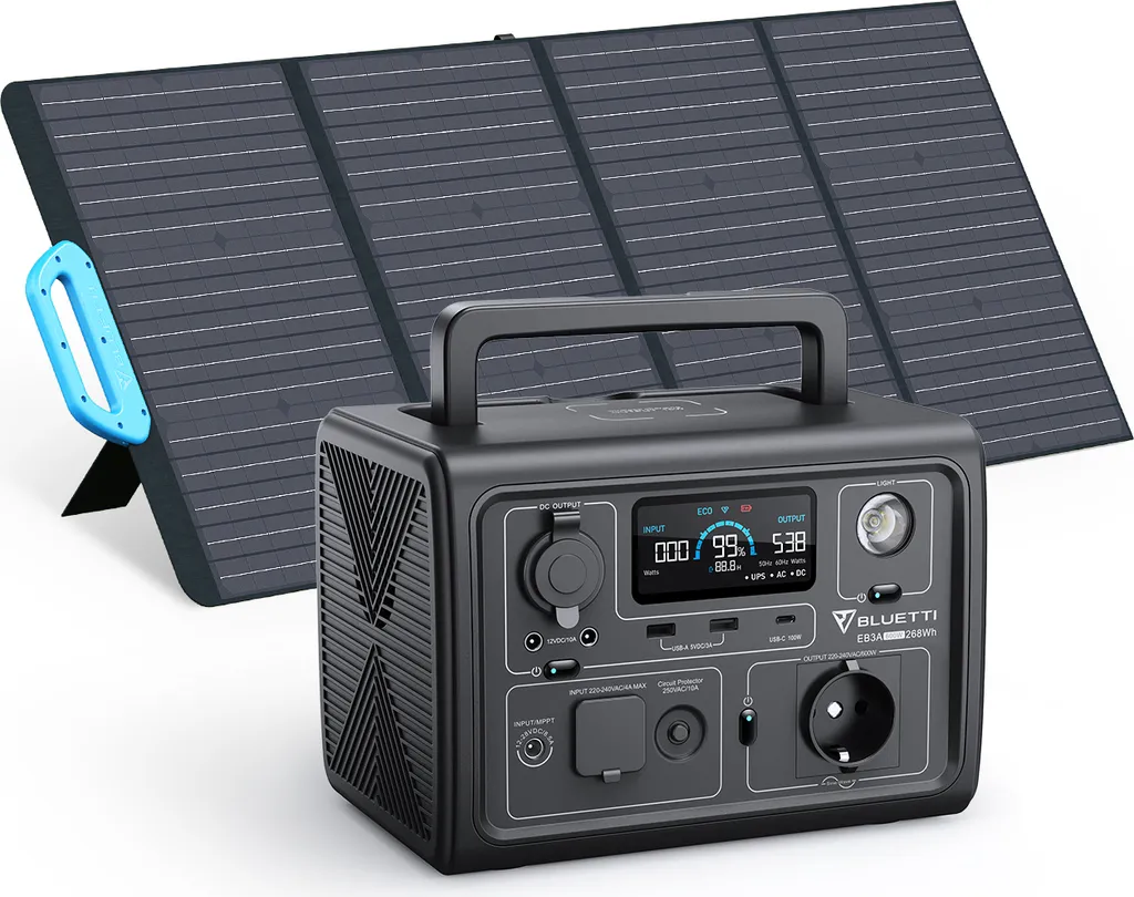 BLUETTI Solar Stromerzeuger EB3A Mit PV120 Solarpanel Enthalten, 268Wh Tragbares Solarspeicher And Solaranlagen Mit 2 600W (1200W Überspannung) Wechselstromsteckdosen, LiFePO4 Batterie Backup Für Outdoor Camping, Reise, Stromausfall
