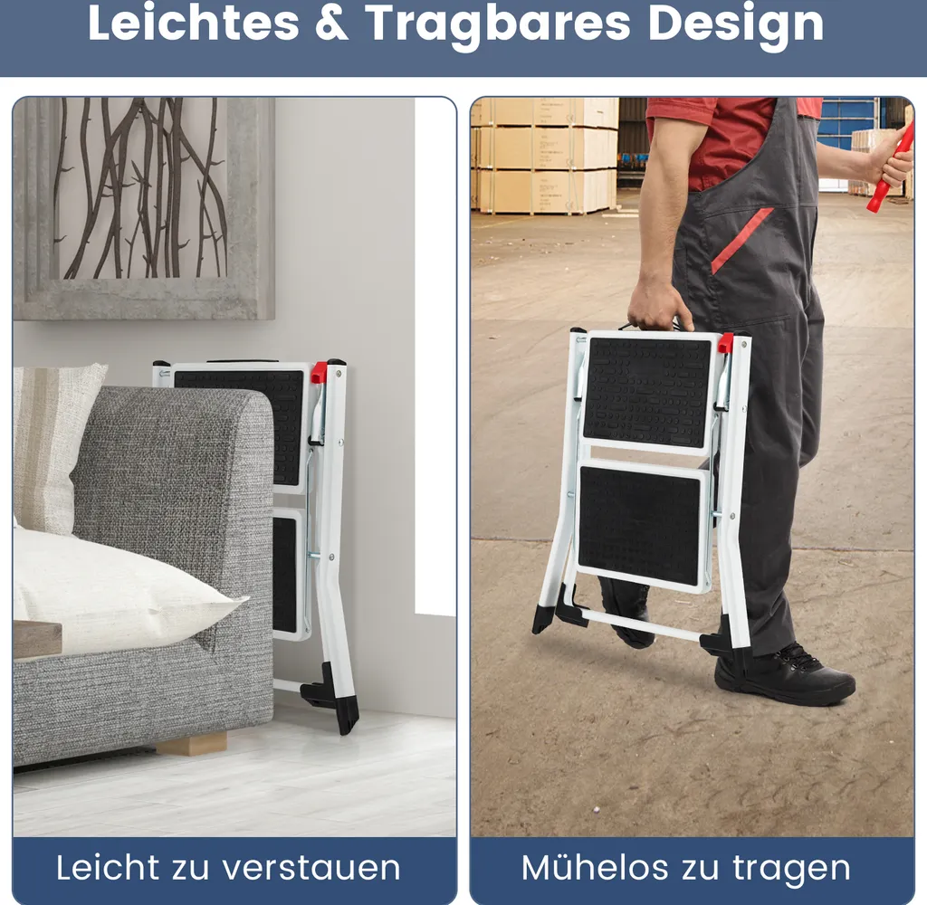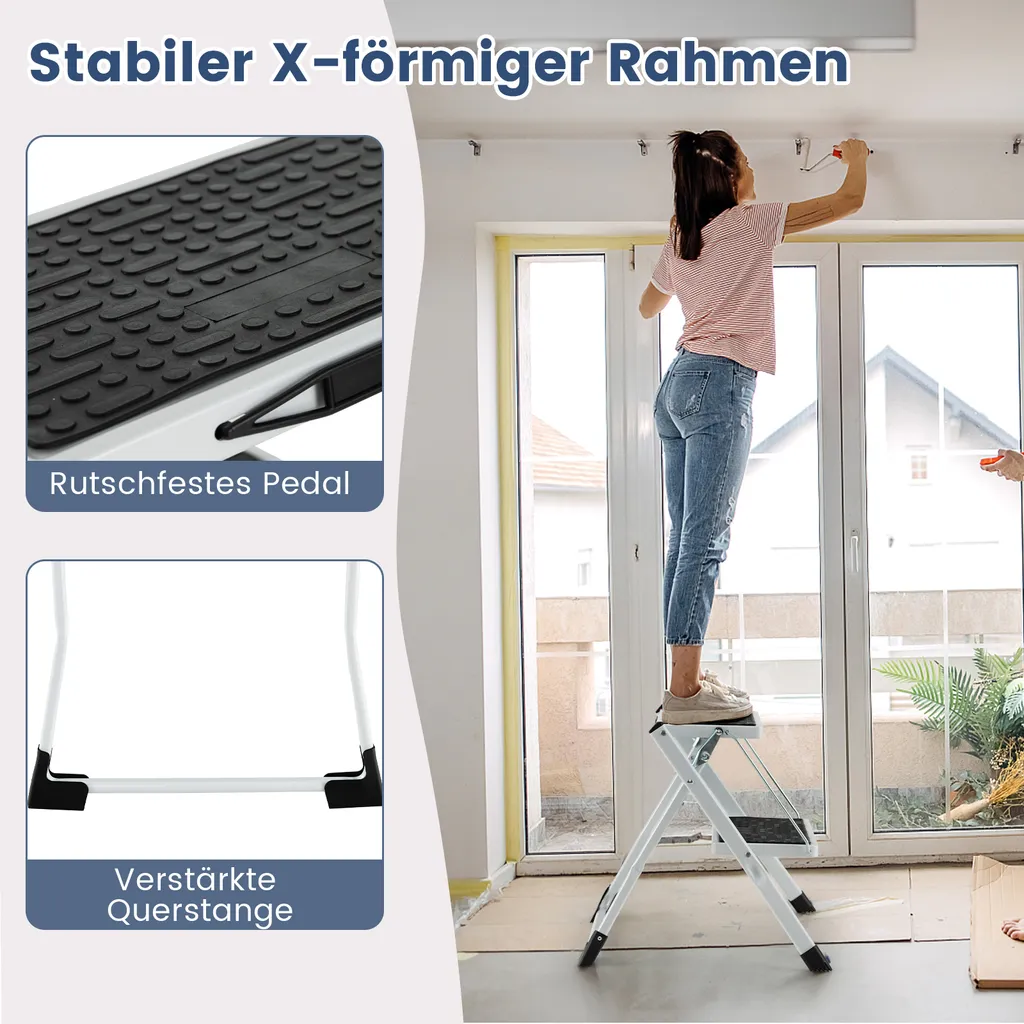 COSTWAY Klapptritt Mit 2 Stufen, Trittleiter Klappbar, 20 Cm Breit, Bis 150 Kg Belastbar, Klappleiter Mit Tragegriff & Anti-Rutsch-Pedal, Haushaltsleiter Für Zuhause Büro Garage, Metall, Weiß