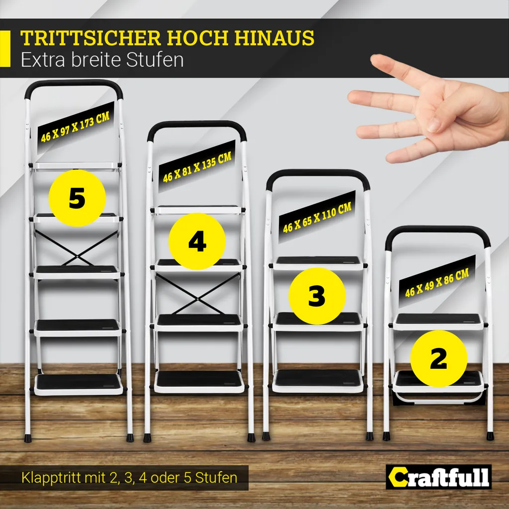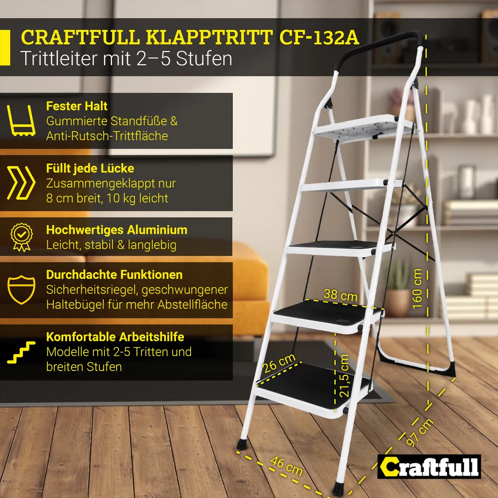 Craftfull Klapptritt CF-132A, Aluminium-Trittleiter 5 Stufen Klappbar