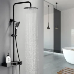 Duschsystem Mit LED Temperatur-Anzeige, Schwarz Duscharmatur Regendusche, Duschsäule Mit Regal, 3 Funktionen Duschset, Überkopfbrause, Edelstahl Verstellbarer Duschstange Für Badezimmer Dusche