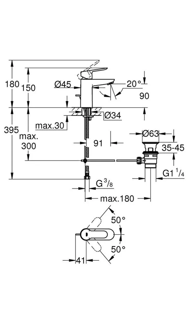 Grohe Einhand-Waschtischbatterie BAUEDGE DN 15 Zugstangen-Ablaufgarnitur 1 1/4″ Chrom