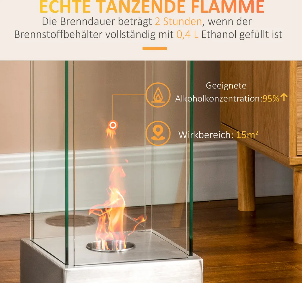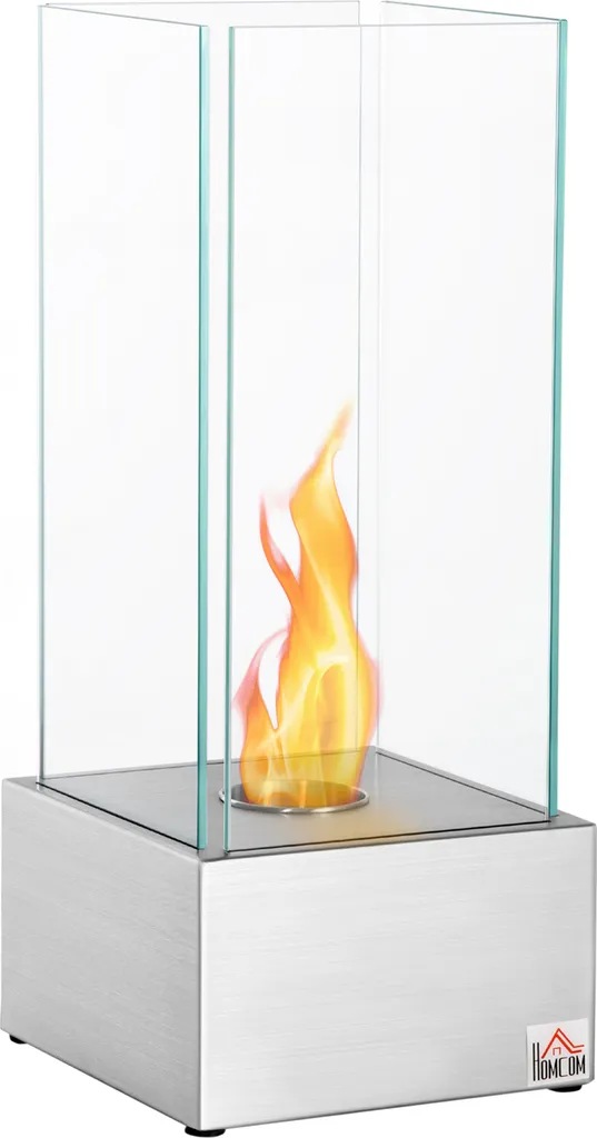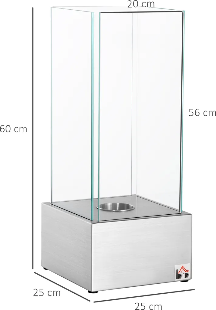 HOMCOM Ethanol-Kamin FeuerschaleEthanol-Brenner 0,4L 2 Std. Brenndauer 15m² Mit Feuerlöschdeckel Edelstahl Hartglas Silber 25 X 25 X 60 Cm