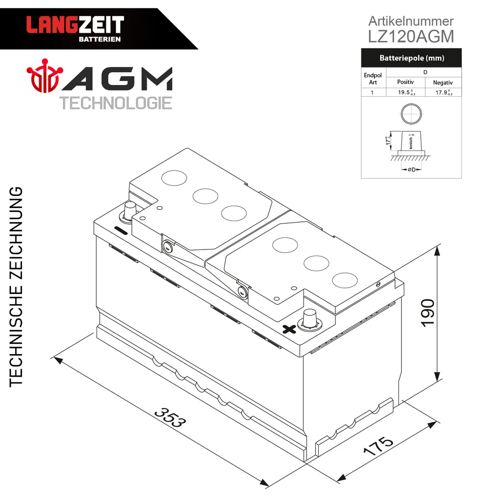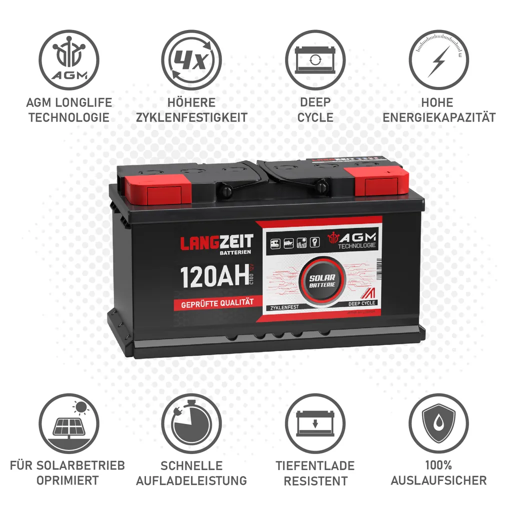 LANGZEIT AGM Batterie 12V 120AH Solarbatterie Wohnmobil Boot Schiff Solar 100Ah