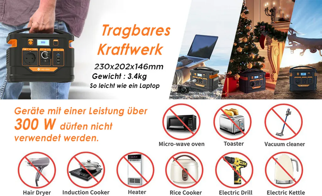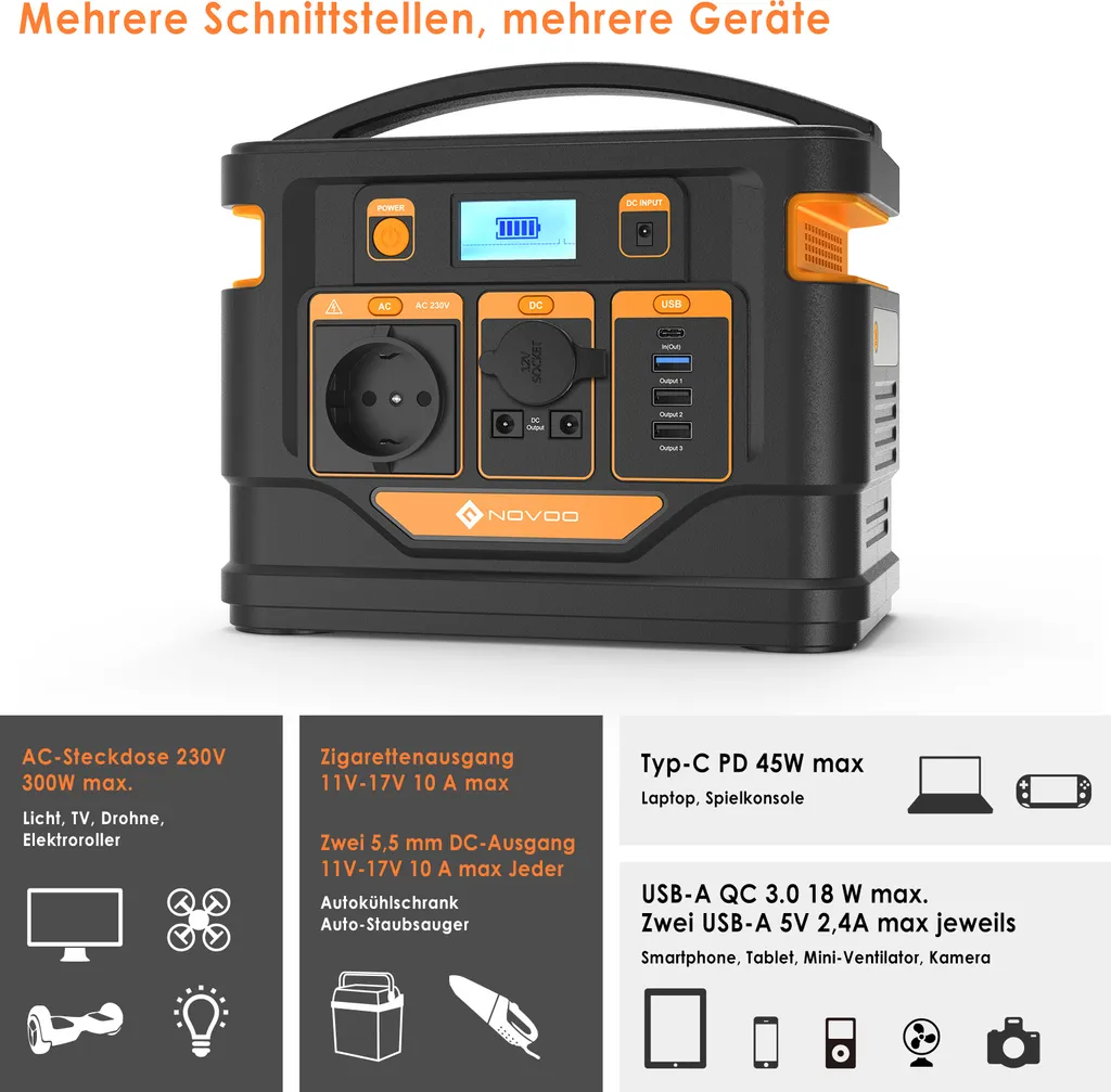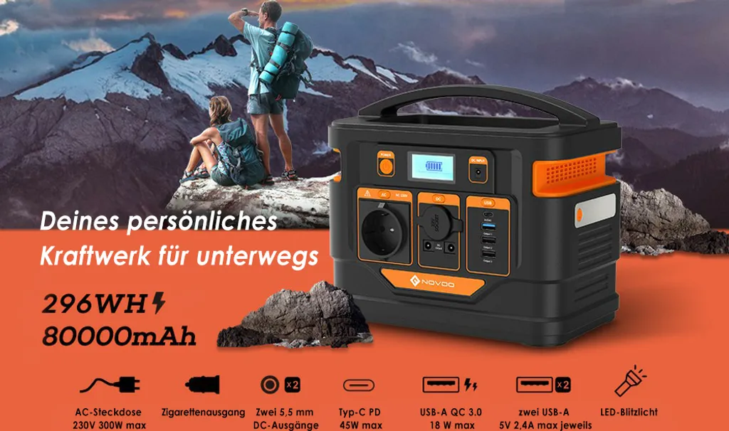 NOVOO Tragbare Stromerzeuger Power Station Solar Stromgenerator Solar Powerbank, 296Wh 80000mAh Mobiler Energiespeicher,230AC Steckdose,PD 45W Type-C,Solar Generator Für Notfall Campin