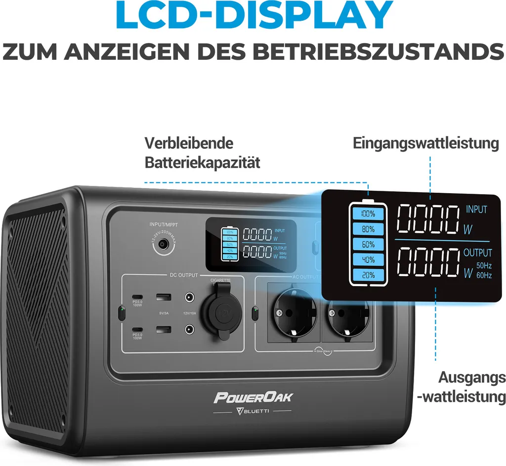 POWEROAK BLUETTI EB70 1000W (Peak 1400W) Gray Solarspeicher Mit SP120 120W Solar Panel 716Wh Solar Generator Stromerzeuger Für Stromausfall Zu Hause, Outdoor-Reisen, Nothilfe, Wohnwagen, Kombi Und Angeln.