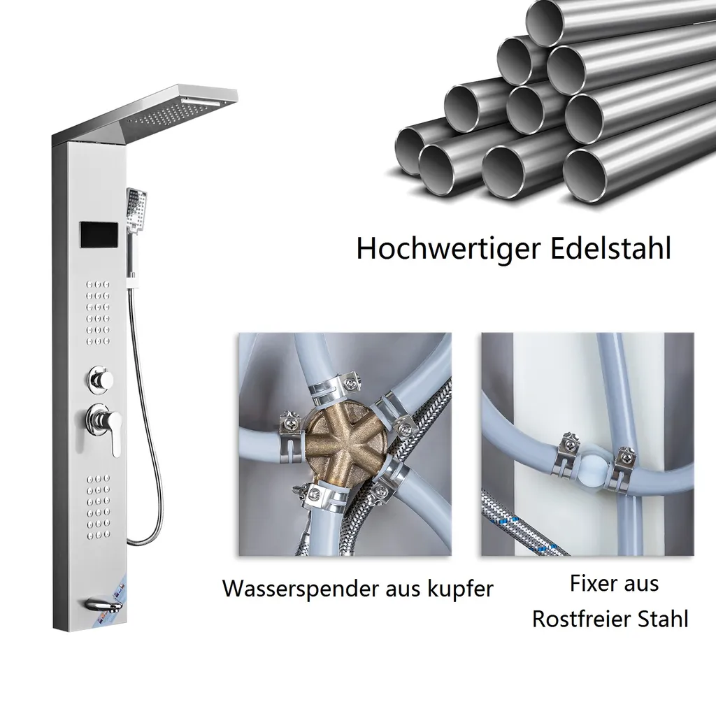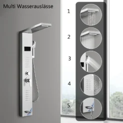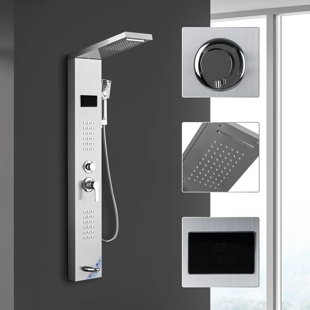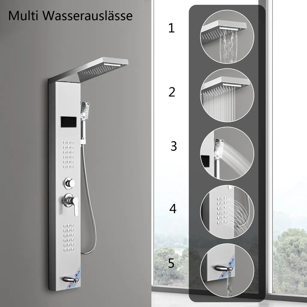 Puluomis Duschsystem Duschpaneel 5 Funktionen Duscharmatur Mit Kopfbrause Und 3 Stufen Handbrause, Regendusche Duschkopf Duschset Aus Edelstahl Mit Display , Silber Weiß