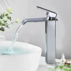 Wasserfall Wasserhahn Bad, Wasserhahn Waschbecken Für Badezimmer, Einhandmischer Waschtischarmaturen, Keramikventil, Kaltes Und Heißes Wasser Vorhanden, Verchromt, Moderner Stil (Silber)